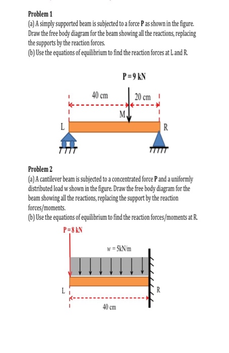 A free body diagram consists of a diagrammatic representation of a single body or a subsystem of bodies isolated from its surroundings showing all the forces acting on it. In physics and engineering, a free body diagram (force diagram, or FBD)... Free-body diagram of left-hand half of beam: Point E is at the midpoint of the beam. Problem 4.5-22 The cantilever beam shown in the figure supports a concentrated load and a segment of uniform load. Draw the shear-force and bending-moment diagrams for this cantilever beam. Free-body diagram of left-hand half of beam: Point E is at the midpoint of the beam. q A b L/2 RB E V M = 0 (Given). Problem 4.5-4 The cantilever beam AB shown in the figure is subjected to a concentrated load P at the midpoint and a counterclockwise couple of moment M1 PL/4 at the free end.