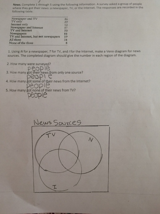 Use the completed Venn diagram to answer the questions. A survey of 75 college students was taken to determine where they got the news about what's going on ...1 answer · Top answer: Draw a Venn diagram with two overlapping circles (with 4 regions). In this case, $$ \begin{align*} U&=\text{set of people surveyed}\ N&=\text{set of people ...