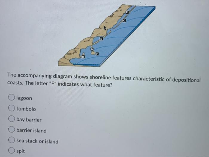 On the accompanying diagram of a barrier island, the letter "C" indicates which island feature? peat bed The accompanying diagram shows shoreline features characteristic of depositional coasts.