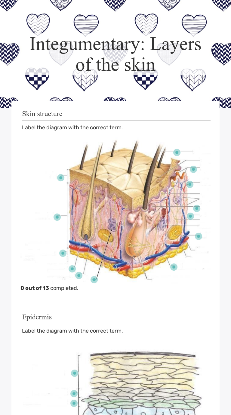Oct 07, 2009 · This is an online quiz called Skin Labeling. There is a printable worksheet available for download here so you can take the quiz with pen and paper. From the quiz author. Worksheet. The Integumentary System . 1. Label the diagram in the spaces provided. Artery Sweat Gland. Hair Shaft Epidermis. Sebaceous (Oil) Gland Vein. Melanin Subcutaneous. Sweat Pore Erector Muscle. Dermis Nerve. Name the three parts of the integumentary system. Describe the types of glands in the skin. 3.