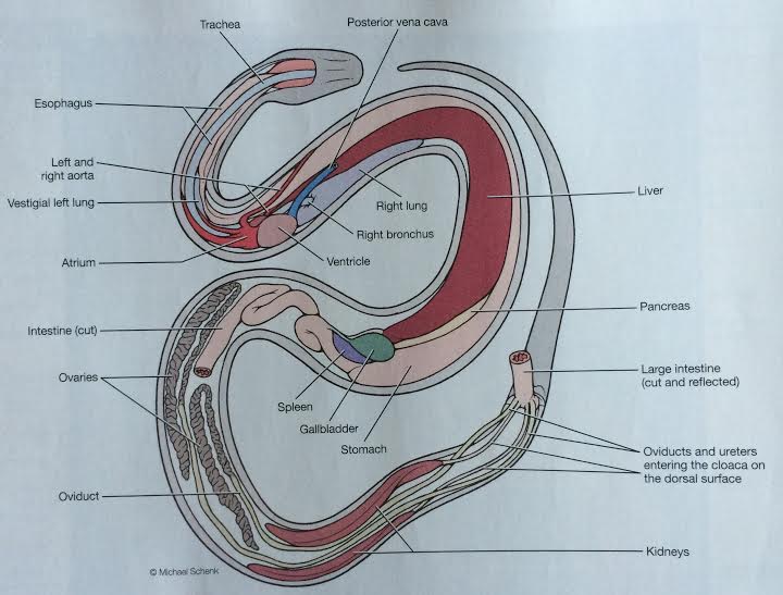 4. You should now have a ventral view of many of the organs of the snake. On the next page you have a generalized diagram of the snake, with organs drawn in. As you proceed with the dissection, label the organs that you see on the diagram. 5. The first organ that you should find is the lung. It is very delicate, so be careful. It will likely
