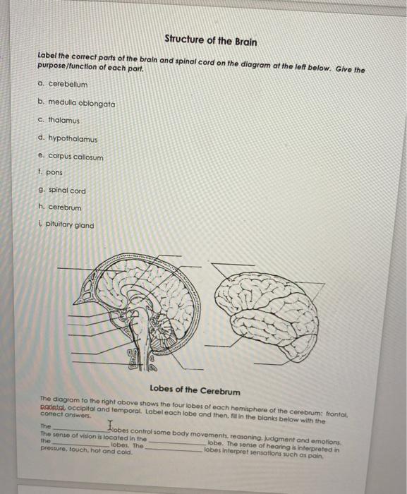 Nervous System - Label the Brain This brain part controls thinking. This brain part controls balance, movement, and coordination. This brain part controls involuntary actions such as breathing, heartbeats, and digestion. This part of the nervous system moves messages between the brain and the body. This part of the cerebrum interprets and sorts information from the senses. Brain Label (Remote) - The Biology Corner Brain Label (Remote) Shannan Muskopf December 29, 2020. This brain labeling activity was created for remote learners as an alternative to the labeling and coloring worksheet we would traditionally do in class. Instead of coloring and labeling on printouts, students use google slides to drag labels to the images or type the answers into text boxes. Label Parts of the Brain Quiz - PurposeGames.com This is an online quiz called Label Parts of the Brain. There is a printable worksheet available for download here so you can take the quiz with pen and paper. From the quiz author. Okay. This quiz has tags. Click on the tags below to find other quizzes on the same subject. biology. brain. Your Skills & Rank. Total Points. 0. 9 Best Images of Brain Diagram Worksheet For Kids - Label ... By the way, about Brain Diagram Worksheet for Kids, below we will see some similar photos to add more info. label ear diagram worksheet, label the brain anatomy diagram answers and crayfish diagram labeled are three main things we will present to you based on the post title. with more related ideas like ear anatomy worksheet, animal nervous ...