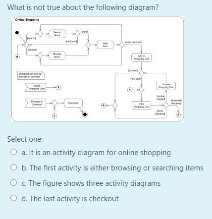 Online shopping UML activity diagram example - customer ... An example of activity diagram for online shopping. Online customer can browse or search items, view specific item, add it to shopping cart, view and update shopping cart, checkout. User can view shopping cart at any time. Checkout is assumed to include user registration and login. This example does not use partitions, most of the actions are assumed to be fulfilled by online customer.