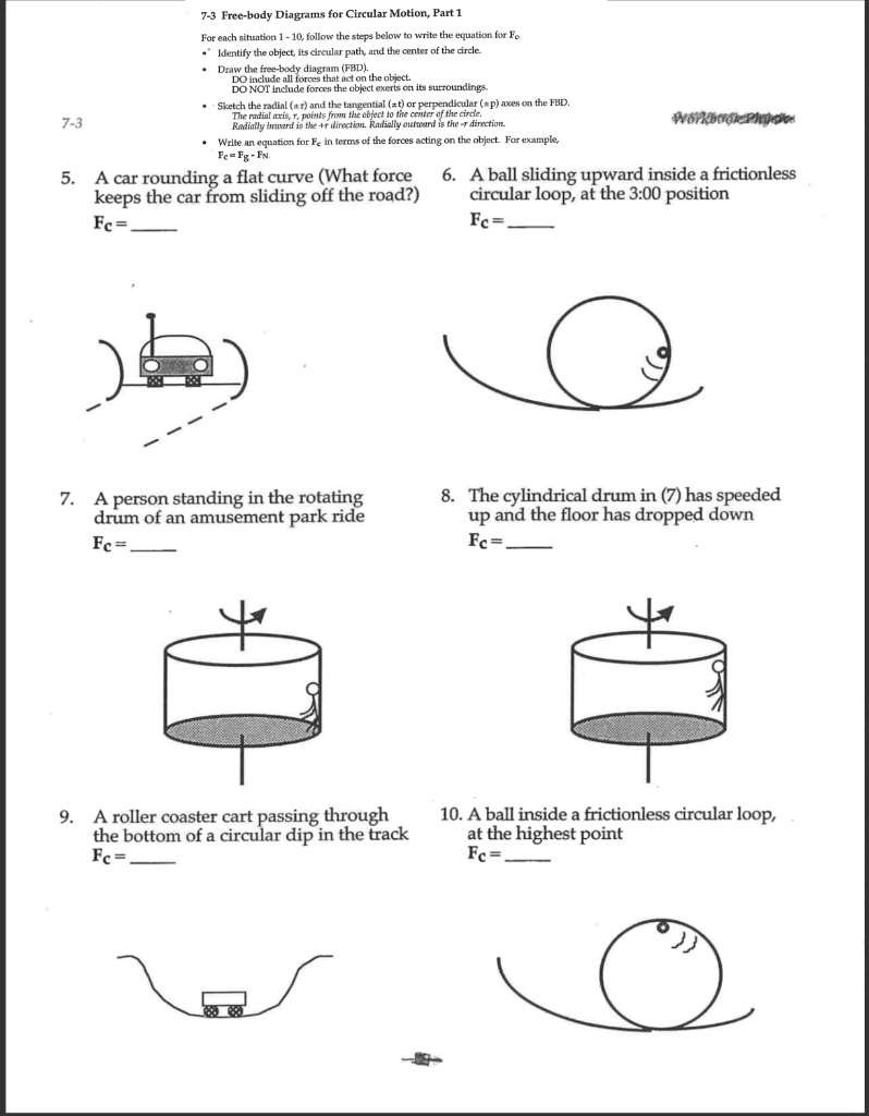 Identifying Free Body Diagrams For Objects In Uniform ... Forces Forces and Free-Body Diagrams in Circular Motion. The Forces in Circles Concept Builder provides learners with the challenge of identifying the free-body diagrams for situations involving the motion of objects in circles. Learners are presented with a short verbal description of an object's motion. › reviews › Circular-MotionCircular Motion and Gravitation Review - Answers #3 So the free-body diagram for such a person would reveal only one force - gravity, pointing straight down. In such a case, the seat does not push upward upon the person. The car has passed over the crest of the hill at such a high speed that it is momentarily raised off the roadway and is unable to support the weight of its passengers.